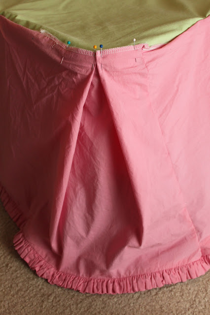 I sewed the pleat with a basting stitch using a 1/2" seam, then put the skirt back on the bed and pinned a 1" hem for the corners as I'd done for the rest of the skirt.